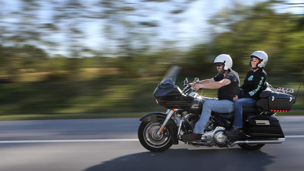 Photo: Tim Keel and his wife, Leah, take a spin on his Harley-Davidson on I-20 East near their Social Circle home. Motorcycles have been a part of Tim’s life since he was young. He has taken several cross country trips on the bike and owned a now-closed motorcycle tire shop with his brother, Ernie. Curtis Compton / ccompton@ajc.com