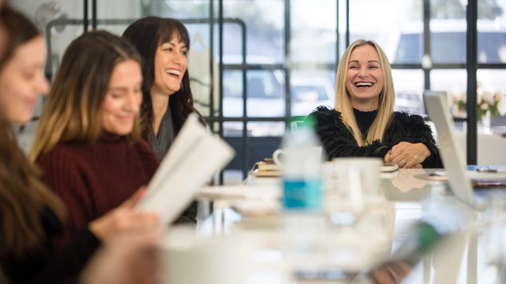 Photo: Dana leads a team meeting at the corporate office. Seated to Dana’s right is Lisa Dimson, Fab’rik’s chief managing officer.