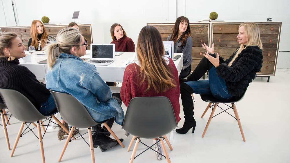 Photo: After a two-month hiatus from her business, Dana returned to Fab’rik in November. Here she leads a team meeting at the corporate office.