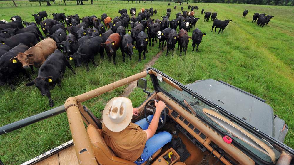 Photo: Harris surveys a herd of cattle on the farm. Brant Sanderlin/AJC