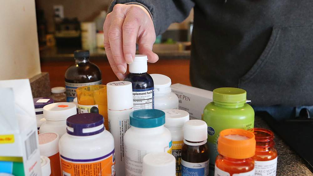 Photo: A year after he got sick, Monroe still takes a multitude of medications, vitamins, and herbal remedies, as evident on his kitchen counter in Athens.