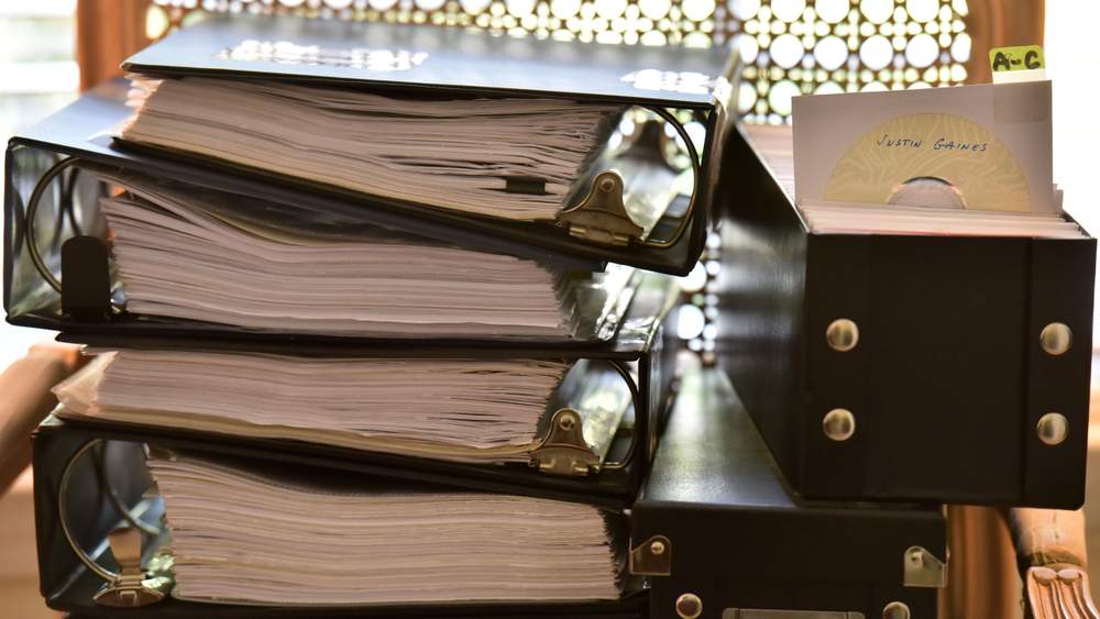Photo: Poulnot’s open case files on Justin Gaines fill binders and CD boxes.