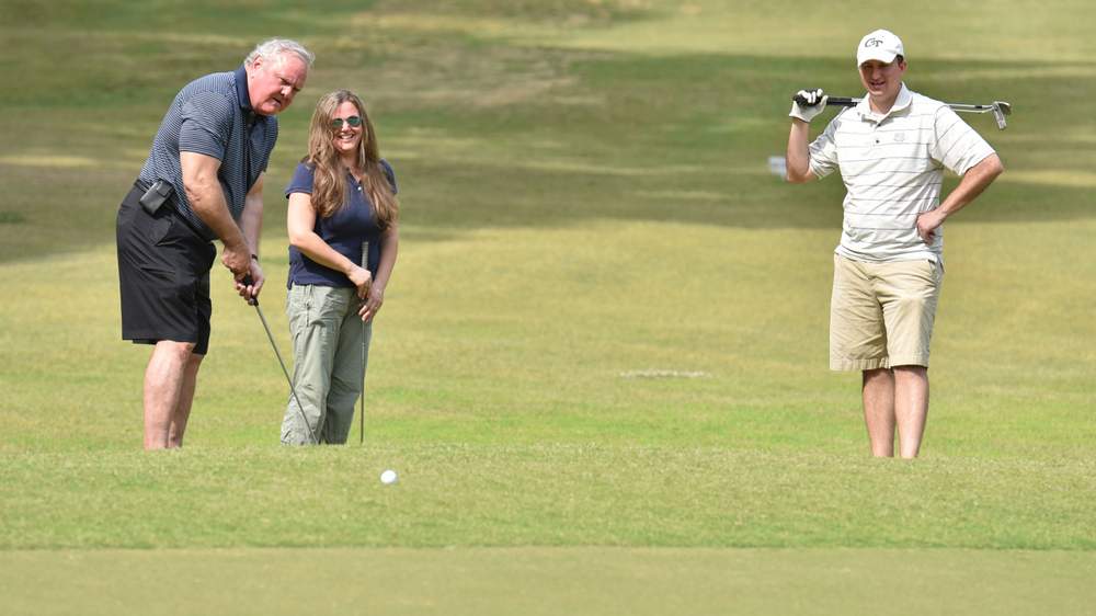 Photo: Poulnot (left) enjoys a round of golf with daughter Julie Perry and son John Poulnot at Bear Creek Golf Course in Monroe last month. Improving his golf game is top priority since he semi-retired.