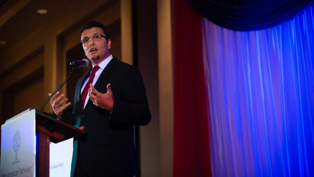 Photo: Heval speaks after receiving a humanitarian award from New American Pathways.