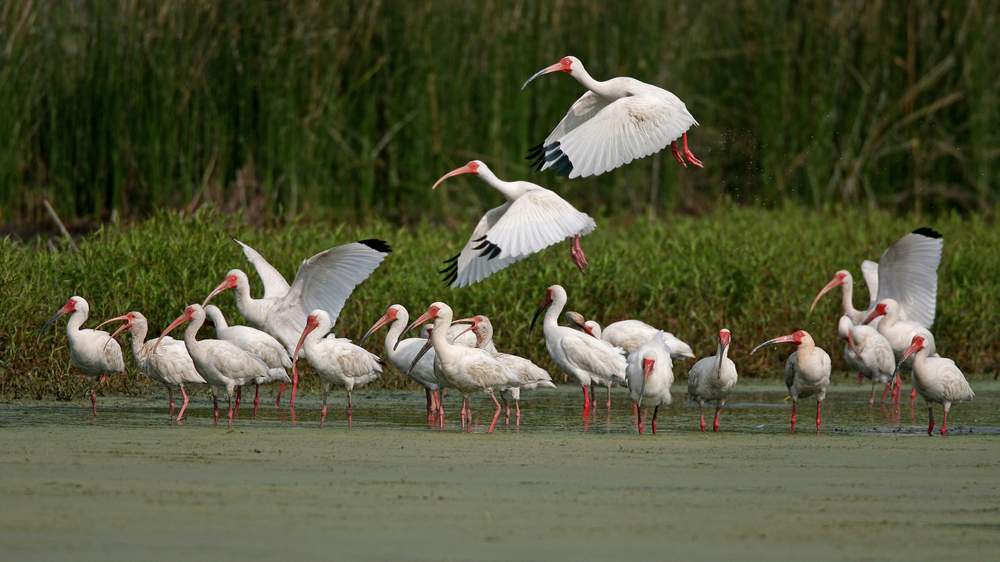 Photo: A flock of adult white ibis land to feed on Goose Pond at Little St. Simons Island.