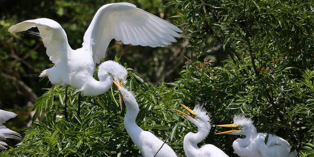 Photo: A Great Egret returns to its nest to feed three waiting chicks at Norm's Pond on Little St. Simons Island.
