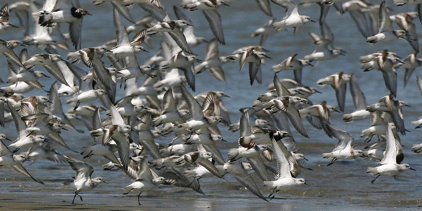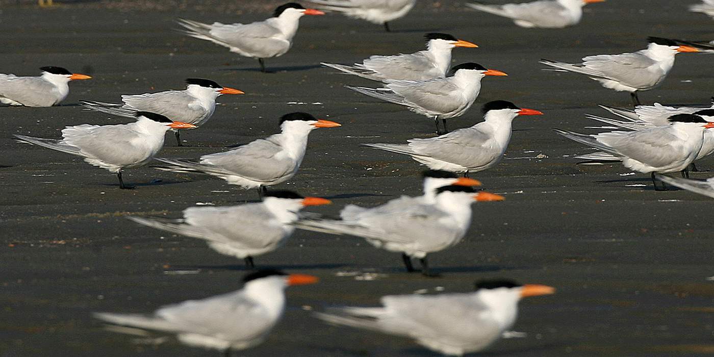 To a symphony of tweets, caws and chit-chit-chitters, black skimmers glide inches above the water, their lower bills dragging the surface to scoop up tiny fish. A pink spoonbill stands stock-still on the far edge of the pond, a single pink eye visible and unblinking. A trio of majestic wood storks swoops in and slowly stalks the shoreline while two male glossy ibises extend their reddish-black wings in battle. A dozen or so gull-billed terns zoom back and forth overhead, as an equal number of small gators silently motor through the water, waiting for prey.