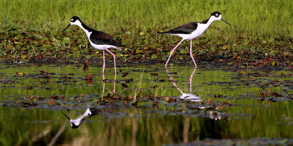 Photo: A pair of Black-necked Stilts pass each other while hunting for small fish just after sunrise at Goose Pond on Little St. Simons Island.