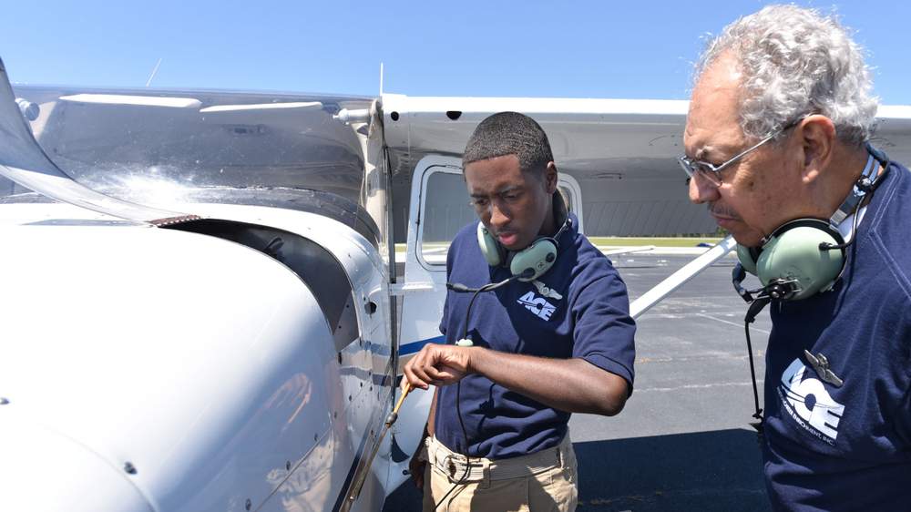 Photo: Julius Alexander (right), founder of ACE Academy, observes Leon complete a flight check on a Cessna plane at Fulton County airport. Leon hopes to be a commercial pilot one day. Hyosub Shin, hshin@ajc.com