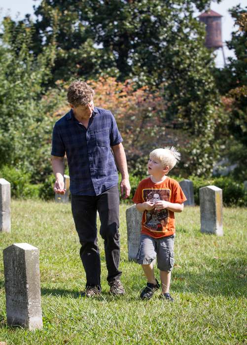 Author Gray Stewart and his 5-year-old son, Henry Stewart Foster, stroll through Oakland Cemetery one day last month. Photos by Steve Schaefer / Special to the AJC