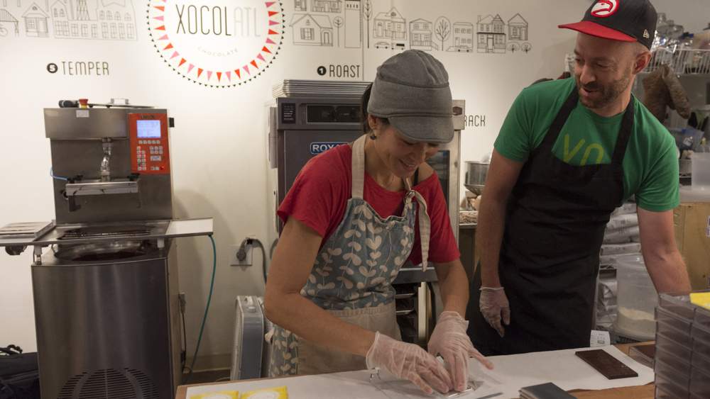 Instead of joining family members for a turkey dinner, Matt and Elaine spent Thanksgiving Day transporting supplies from their Old Fourth Ward loft to Krog Street Market. They had no car, so they had to make multiple trips pushing supplies on hand trucks down a hill — paper towels, glass jars, cacao beans.